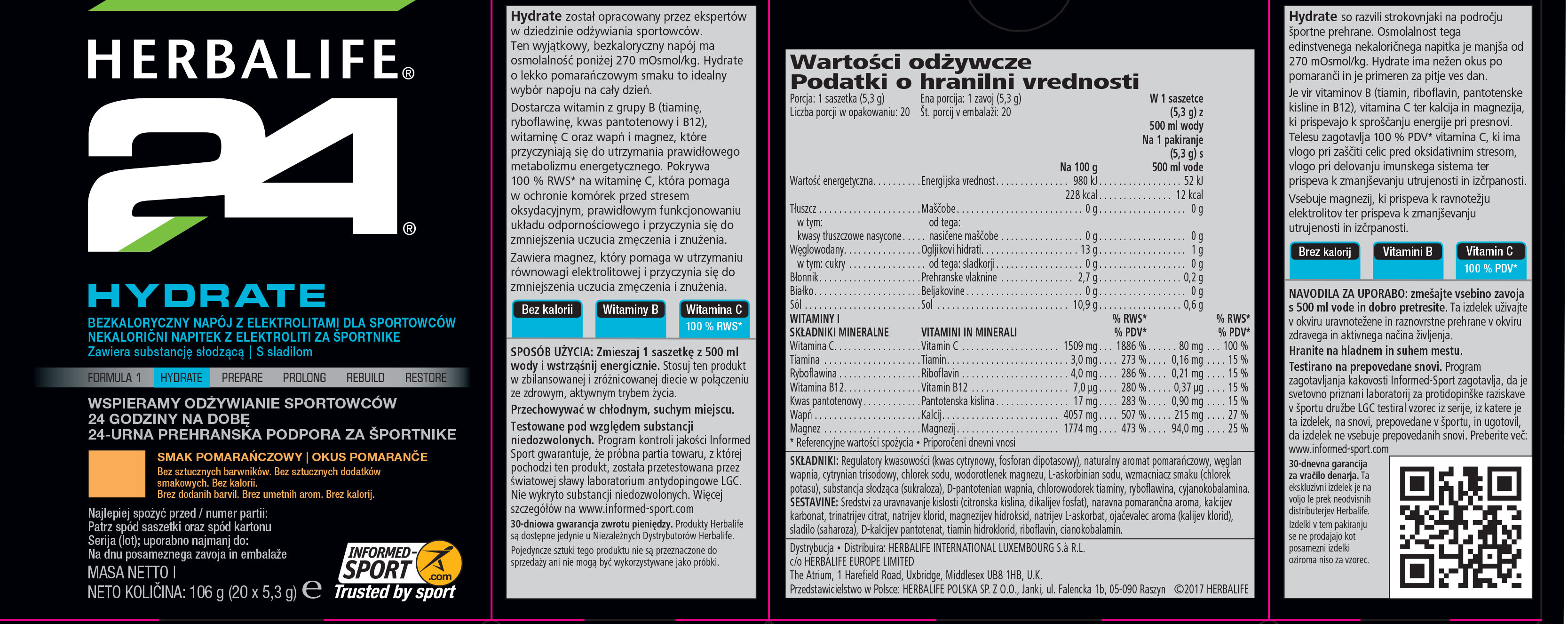H24 Hydrate je izotonický nápoj s obsahem elektrolytů, podporuje hydrataci a metabolismus pomocí vitamínu B. H24 Hydrate je elektrolytický nápoj bez obsahu kalorií pro podporu příjmu tekutin. Obsahuje 100% doporučeného denního množství vitamínu C pro snížení únavy organismu. H24 Hydrate je určen pro rychou obnovu tekutin, bez obsahu kalorií. Díky lehlé pomerančové příchuti je perfektní volba pro dostatečnou hydrataci a připraví organismus pro dosažení maximální výkonosti. Tato sportovní výživa byla vyvivuta na základě nejnovějších vědeckých poznatků, byla vytvořena odborníky na sportovní výživu.  Je určena pro všechny milovníky jakéhokoli sportu. Výrobek je testován na zakázané látky, bez umělých barviv.