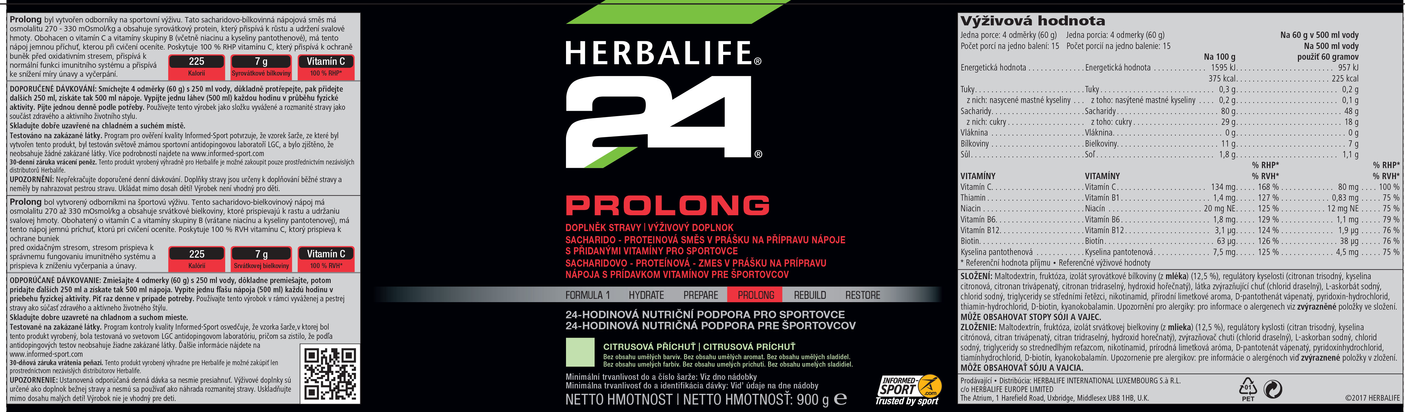 H24 Prolong je izotonický nápoj s obsahem sacharidů a proteinu s přidanými vitamíny B, B1, B12 umožňuje využití kalorií pro dlouhodobou výkonnost. Syrovátkový protein, který je obsažen v tomto výrobku působí jako ochranný prostředek, zabraňuje poškození svalstva během sportu či fyzickém výkonu. Díky lehké citrusové příchuti je perfektní volba pro prodloužení účinku během namáhavého fyzického výkonu. Tato sportovní výživa byla vyvivuta na základě nejnovějších vědeckých poznatků, byla vytvořena odborníky na sportovní výživu.  Výrobek je testován na zakázané látky.