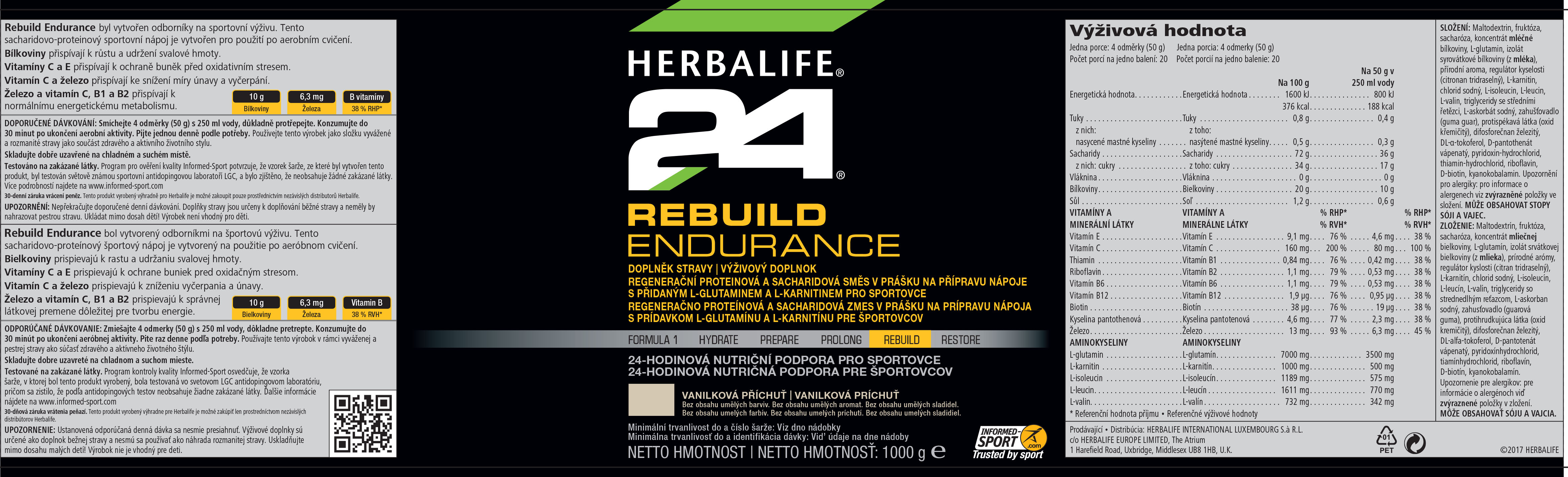 H24 Endurance (obnova vytrvalosti) - Regenerační nápoj s obsahem sacharidů a proteinu určený pro vytrvalostní sporty. Proteinový nápoj s přidaným L-Glutaminem, který podporuje imunitní systém a L-Karnitimem, který podporuje metabolismus a regeneruje svalovo hmotu po fyzickém výkonu. Je určen především pro regeneraci svalové hmoty po ukončení fyzické aktivity, obnovuje zásoby glykogenu a svalové hmoty. Tato sportovní výživa byla vyvivuta na základě nejnovějších vědeckých poznatků, byla vytvořena odborníky na sportovní výživu.  Výrobek je testován na zakázané látky. V příchuti lahodné vanilky.